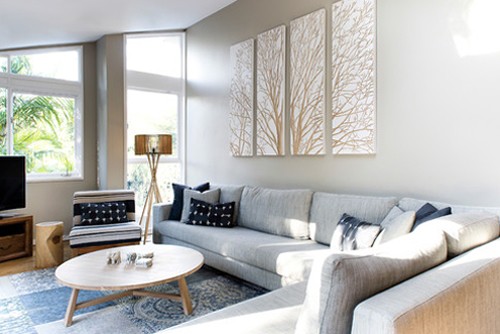 Expansive walls call for equally expansive art, which can be costly – not to mention impractical if you move house and need to find a new spot for your piece. As a more versatile option, look for multiple panels that create one large artwork so they can be separated if necessary.