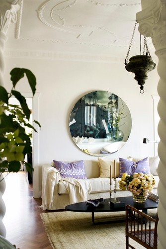 A mirror hung strategically to fill an empty surface will work particularly well in smaller homes, creating the illusion of more space by reflecting light. Frame with string lights or group several smaller mirrors together to bring brightness and depth to a bare wall.
